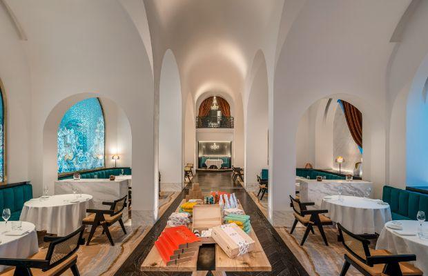 Iconic location: Set within the new Raffles Doha hotel, the restaurant provides a dose of Mediterranean design and flavour on the Arabian coast. The dining rooms blends classical white marble arches with plush dark green and red velvets, surrounded by Italian-inspired scenography. Raffles Doha is itself located in the capital’s famous Katara Towers building, the enormous waterfront landmark whose design was inspired by the nation’s traditional crossed-swords emblem.